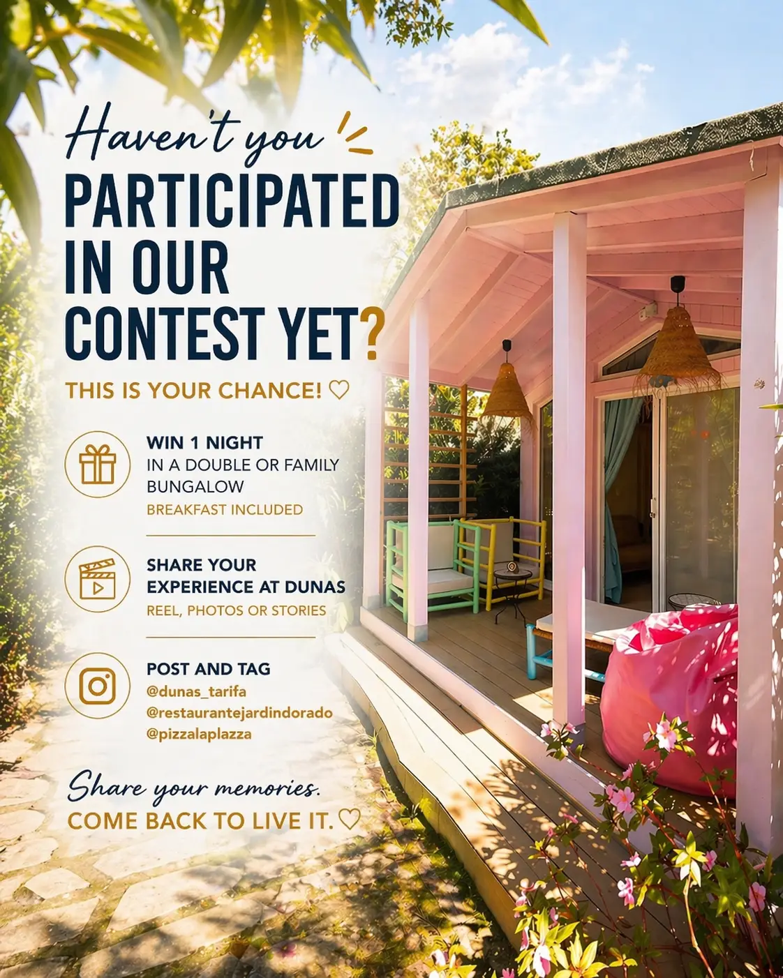 This luxury accommodation offers exclusive access to guests, its own private garden, a small kitchenette equipped with electric hob, microwave/oven combo and all the standard amenities that Dunas Tarifa offers its guests. Including TV and air conditioning, microwave/combi-oven.